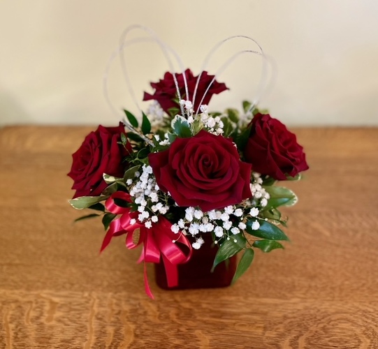 The Forever True Love Bouquet is a classic cube glass design with four gorgeous roses accented with a glitter heart. Baby's Breath and fancy greenery finish off the design.