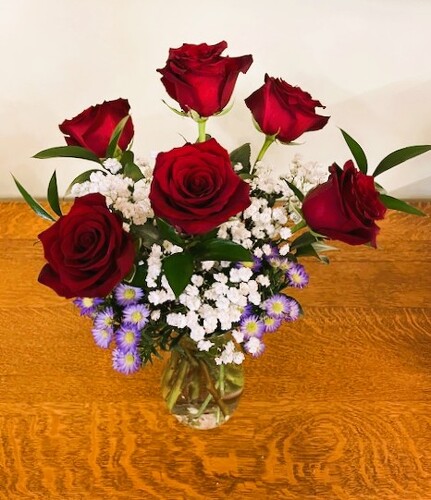 Six Red Rose Bouquet arrives in a vase with fancy greenery and some dainty filler flower.